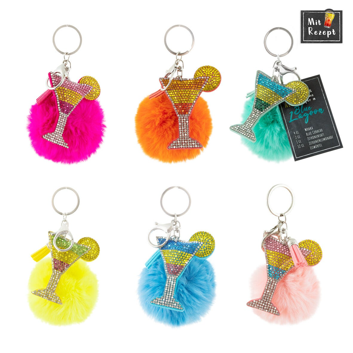 Leuke tashanger met strass cocktailglas, pompom, receptenkaartje cocktail (random kleur)