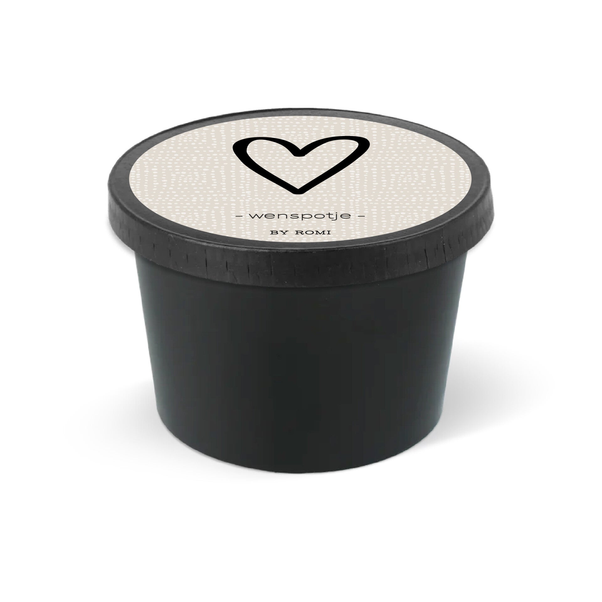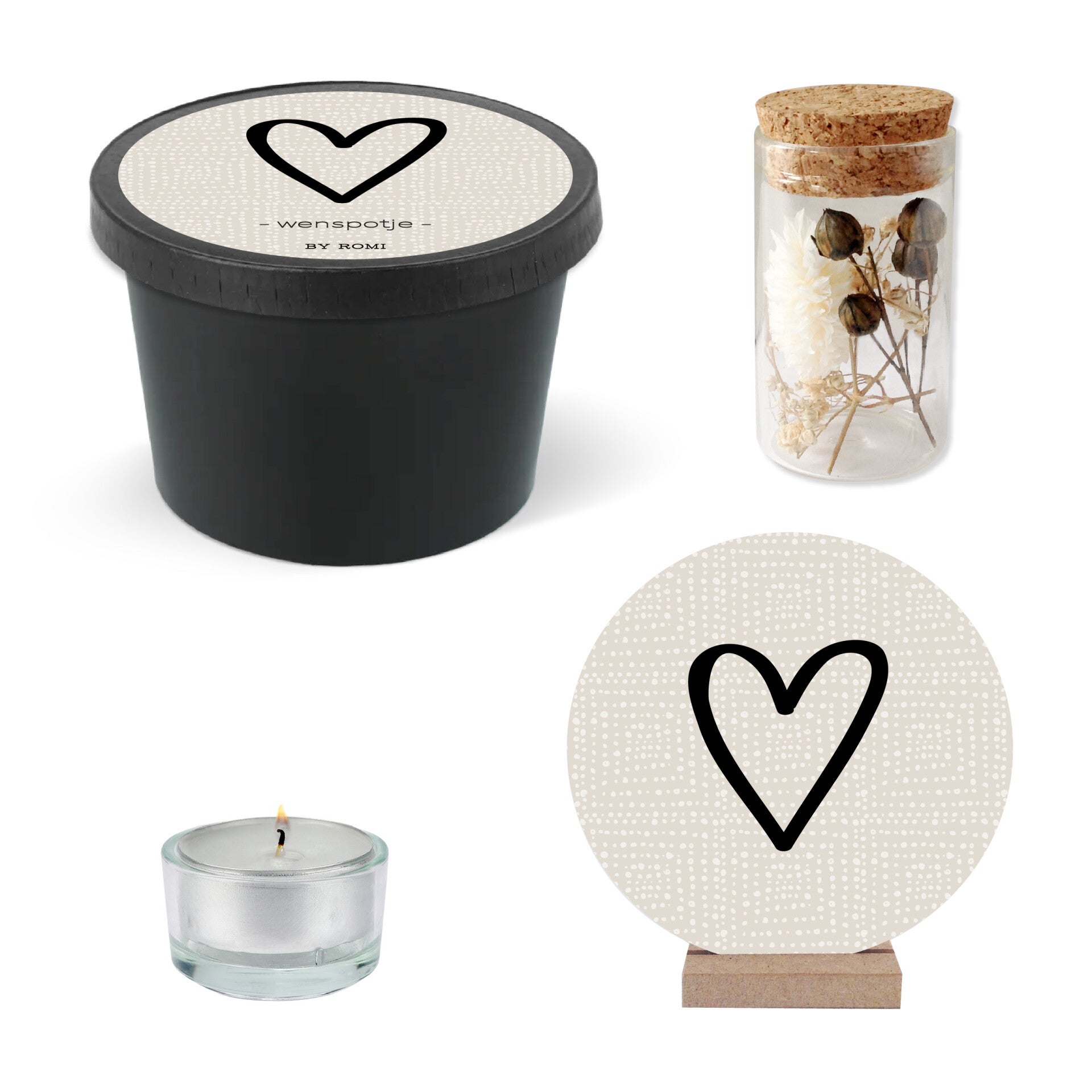 - Het leuke zwarte wenspotje van By Romi bevat een wooncirkeltje met hartje (forex), een houder, een vaasje met droogbloemen en een waxinelichthouder van glas inclusief kaarsje.
