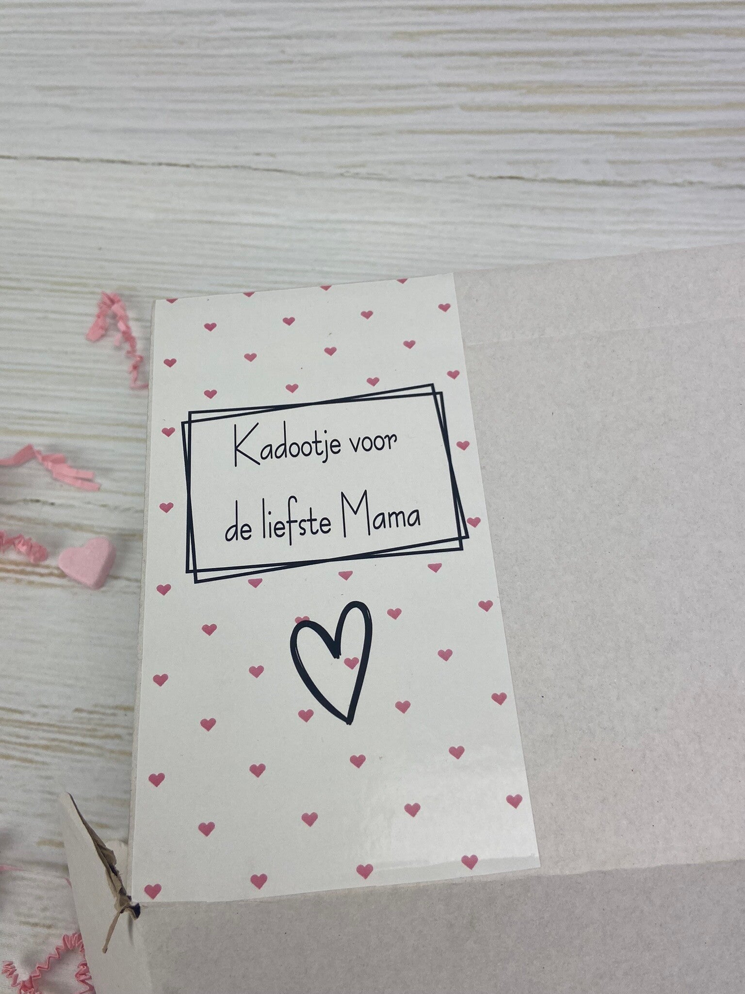 - Doosje wordt gevuld met sizzle, vloeipapier en bijpassende sticker: Kadootje voor de liefste mama