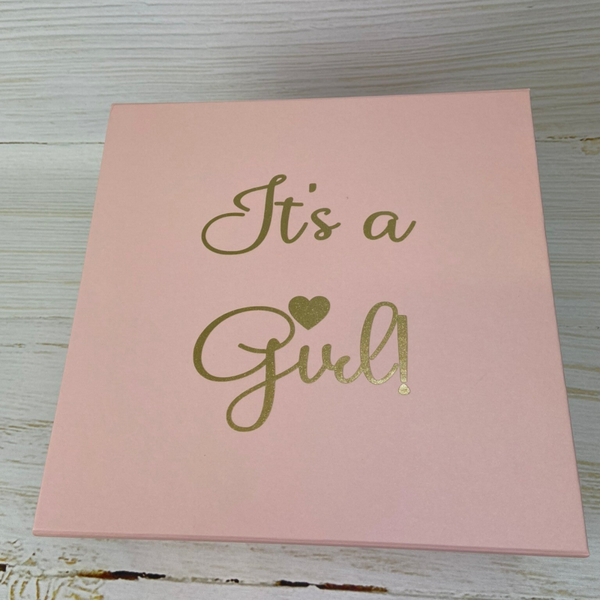 Roze magneerbox, gevuld met roze sizzle & hartjes vloeipapier, tekst: It's a girl in goudopdruk.