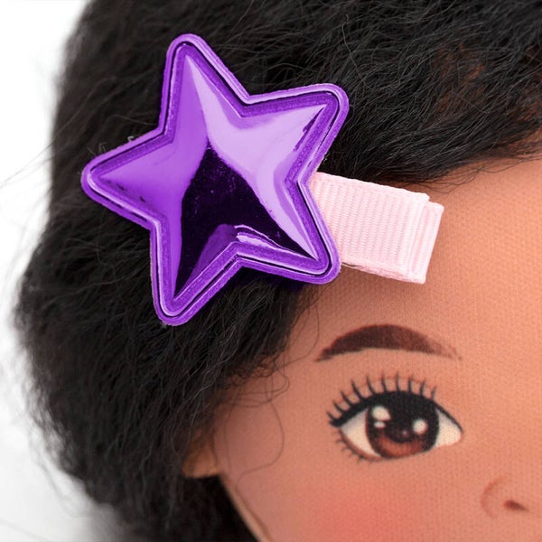 Setje Foot Wear voor de leuke Sweet Sister poppen. Gave witte gympen, paarse ster haarclipje en stoere zilveren buik/rugtasje