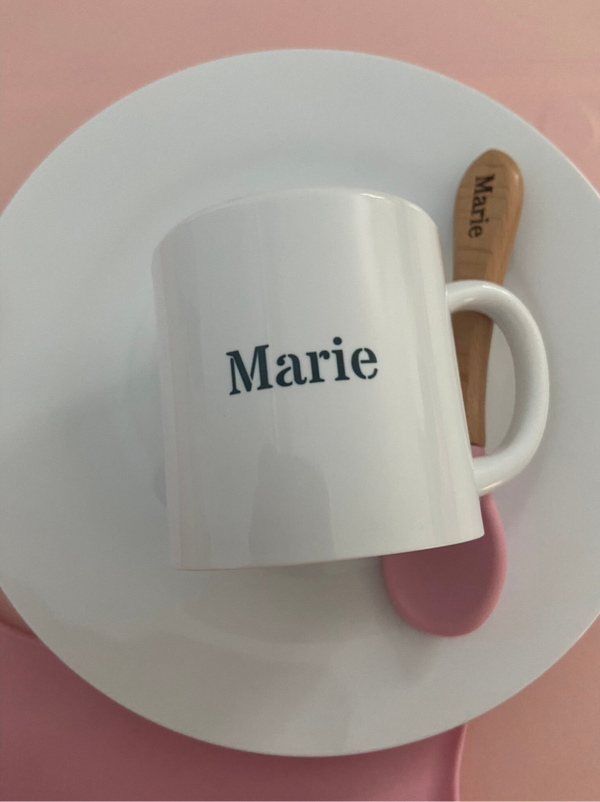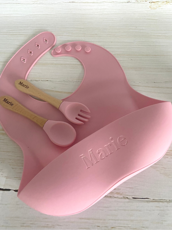 - Sillicone slab gegraveerd met naam & bamboo bestekje gegraveerd met naam, kleur roze