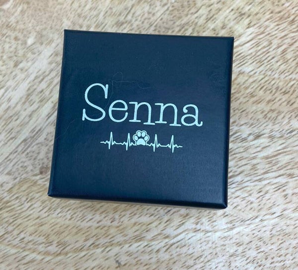 Daarnaast kun je een prachtig gegraveerd doosje toevoegen..dat maakt je kado helemaal compleet! Op het doosje komt de naam en de afbeelding van een hartslag met pootafdruk (zie voorbeeld)