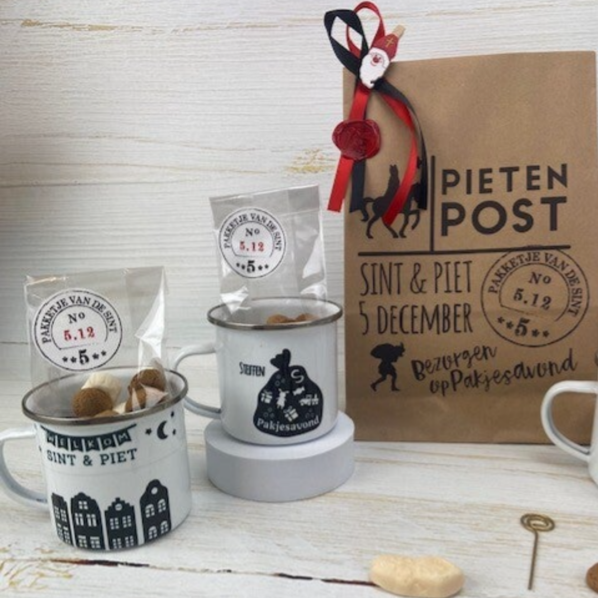 Leuke Sinterklaasverrassing Zakje Pietenpost met emaillemok gevuld met pepernoten. En natuurlijk is de mok gepersonaliseerd!