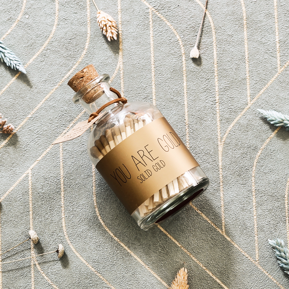 Een glazen potje met 80 gouden lucifers. Met deze lucifers ben je helemaal in stijl met een matchende kaars. Het potje wordt gesierd met de tekst 'You are gold'.