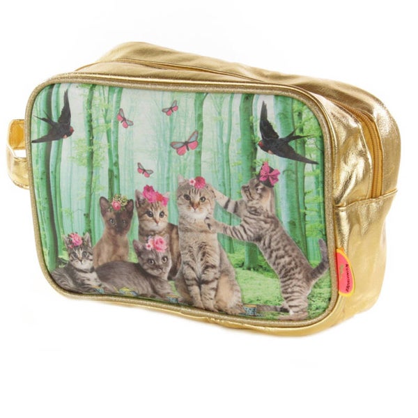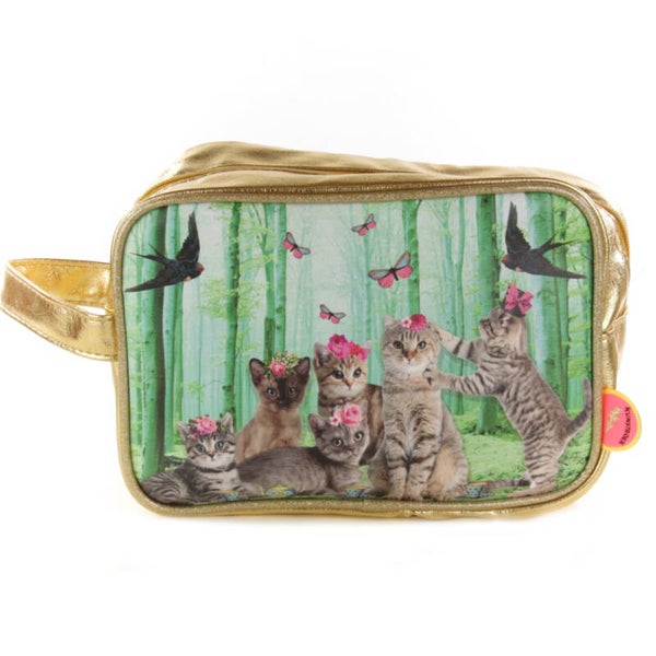 Praktische toilettas van shiny kunstleer met vrolijke fantasy print van Kunstboer. Gemakkelijk schoon te maken en met nylon afgewerkt binnenin.