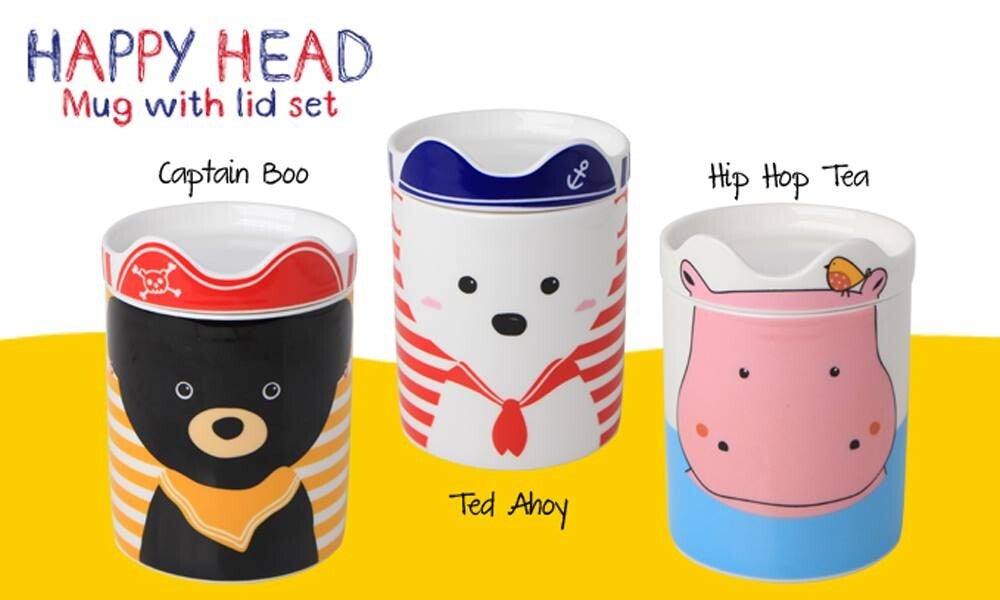 Geweldige porseleinen mok van hoge kwaliteit met deksel voor volwassenen en kinderen. Deksel is ontworpen als een grafisch element - het is een hoed of oren van een dier. Design dat jarenlang meegaat.