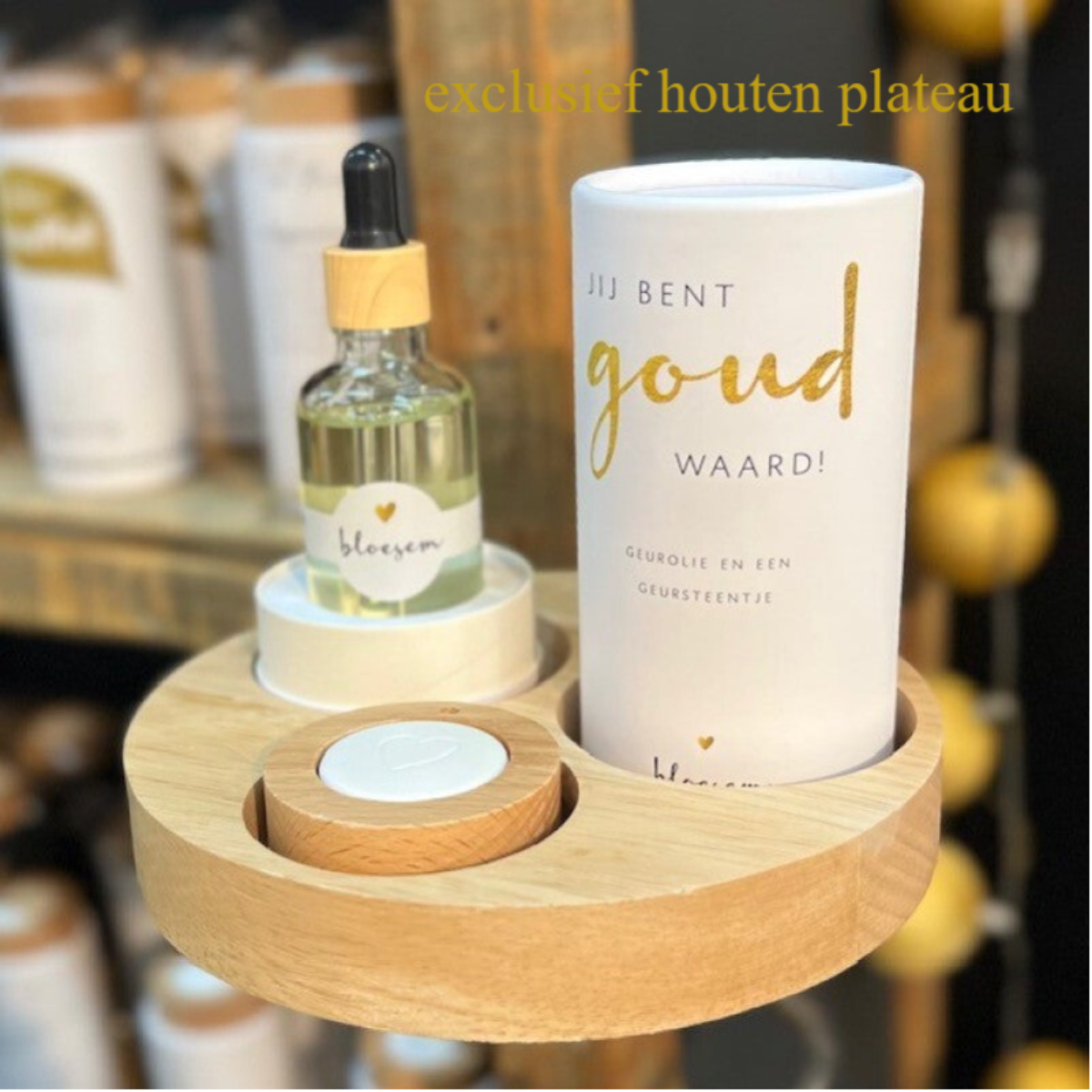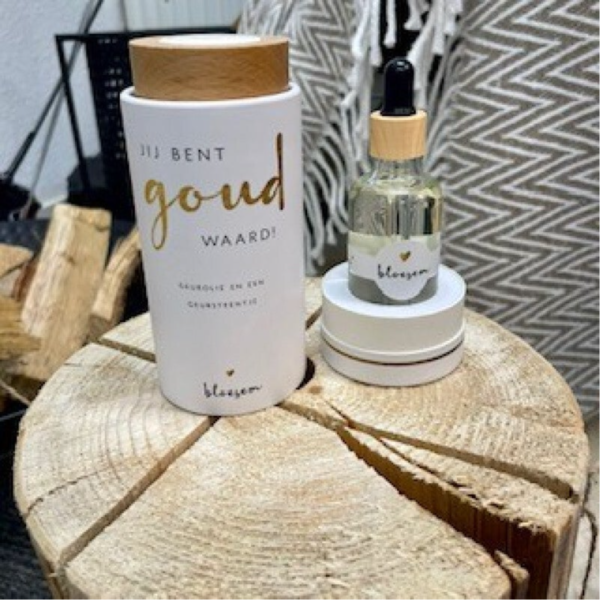 Geschenkkoker met olie en geursteentje met passende tekst.
