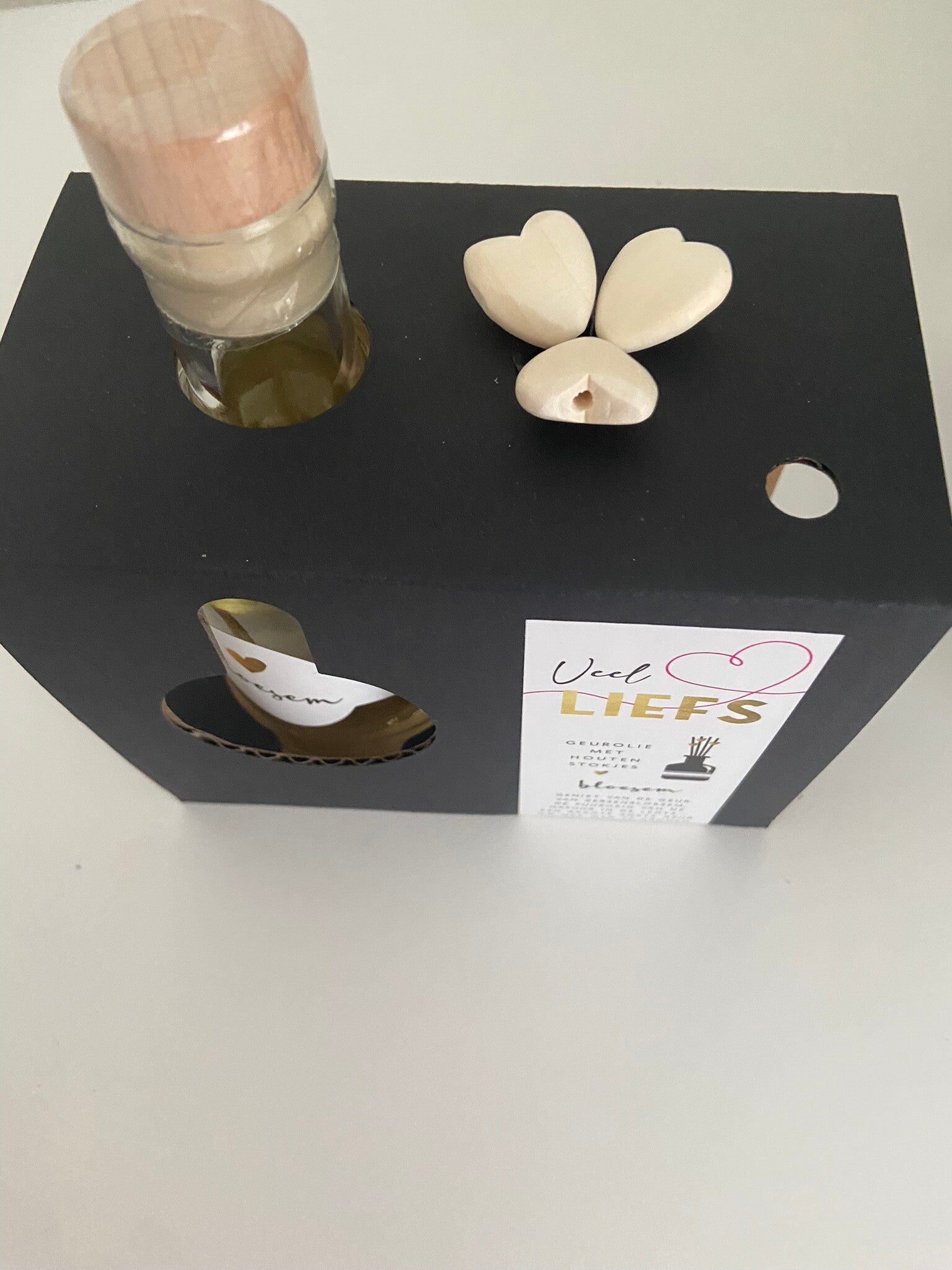 Bij het flesje van 200 ml zitten geurstokjes waar je houten hartjes op kunt schuiven.