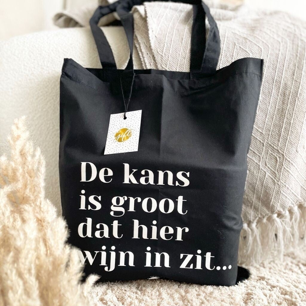 Op zoek naar een leuke en praktische tas om je favoriete drankjes in te vervoeren? Dan is deze katoenen tas met de tekst “De kans is groot dat hier wijn in zit” de perfecte keuze voor jou! Met zijn stijlvolle en speelse ontwerp is deze tas niet alleen handig, maar ook een geweldig cadeau-idee voor vrienden en familie die van wijn houden.