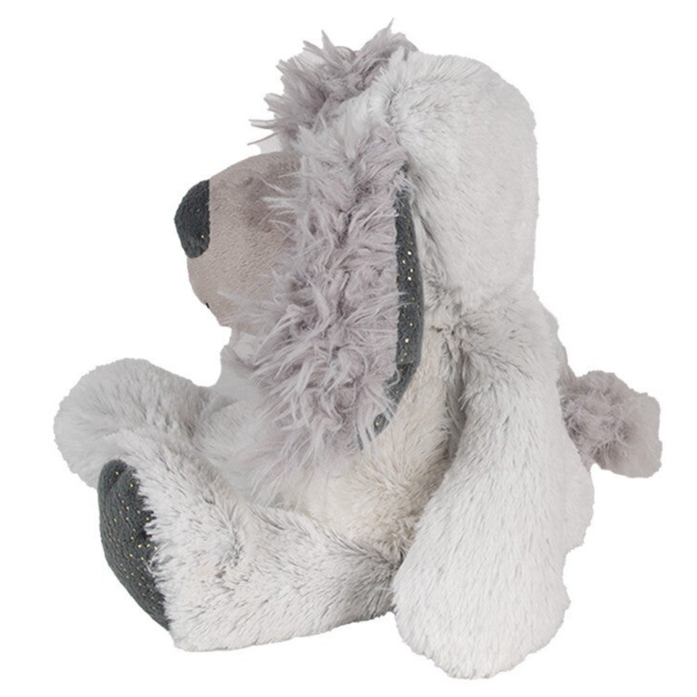 Schattig lichtgrijs knuffelhondje. Een heerlijk zachte puppy met krullend haar aan zijn oren ( met glitter, ook glitter op zijn neus) en staartje. Lange slappe flaporen en armen zijn gemakkelijk vast te houden. Gevuld met korreltjes aan de onderkant, kan zitten en op een plank worden gezet.