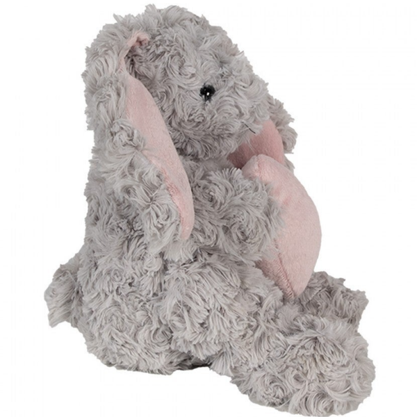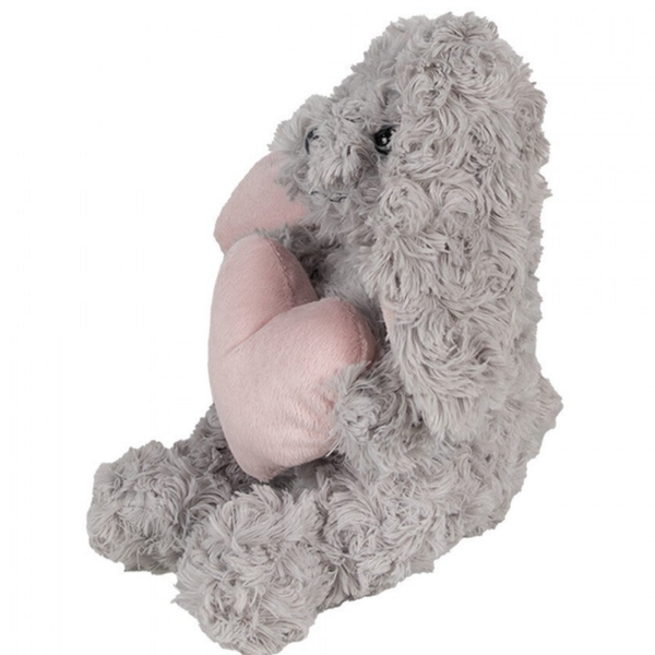 Schattig grijs knuffelkonijn met een roze hartje. Lange, slappe flaporen en armen die gemakkelijk vast te houden zijn. Gevuld met korrels aan de onderkant, kan zitten en op een plank worden gezet.