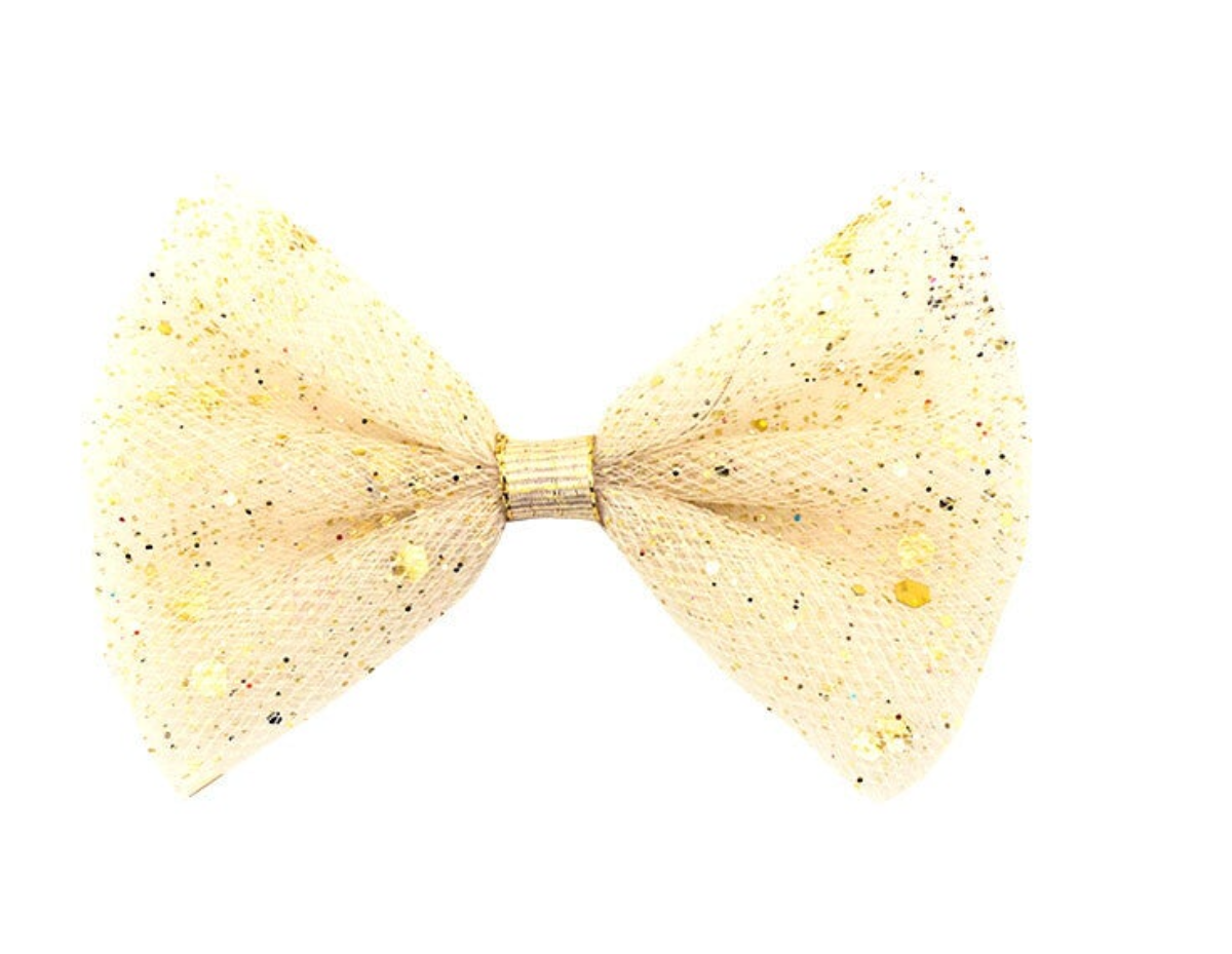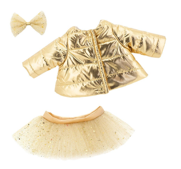 Stoer gouden, doorgestikt bomberjack met Tule rokje (met glitters) en lieve tule glitterstrik.
