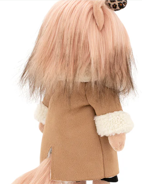 Ze komt superstoer gekleed compleet met laarsjes, panterstrik, zwart glitterjurkje en bruin winterjasje met fake fur...