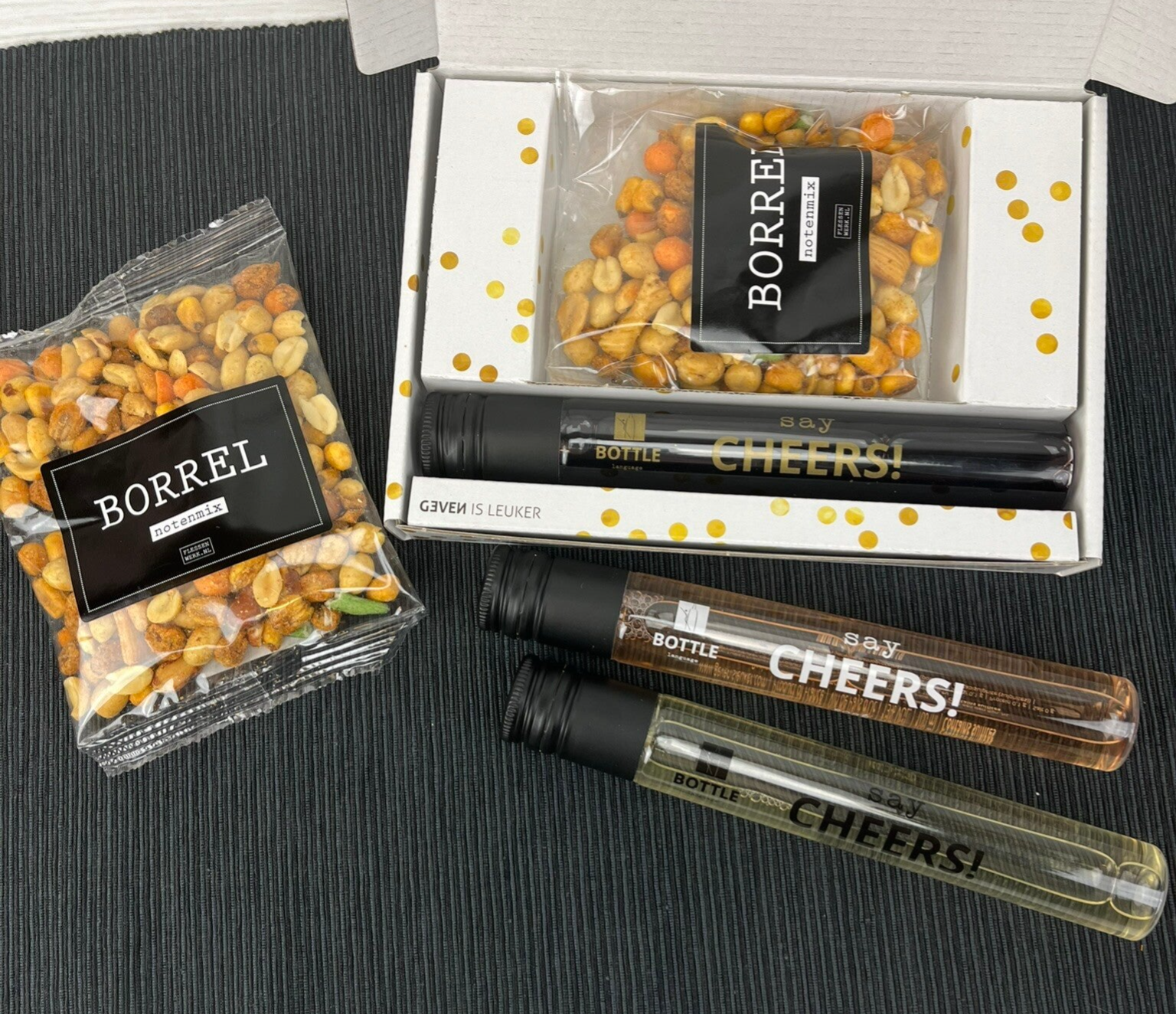 gevuld met wijntube, keuze uit wit,rood, of rosé & zakje borrelnotenmix.