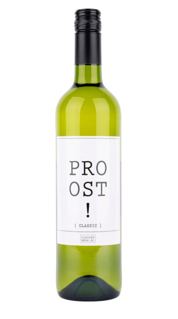 Een super leuke fles witte wijn met wit etiket en tekst 'Proost!'. Deze fles Sauvignon Blanc is de ultieme verfrissende wijn. Het perfecte kado om te geven.