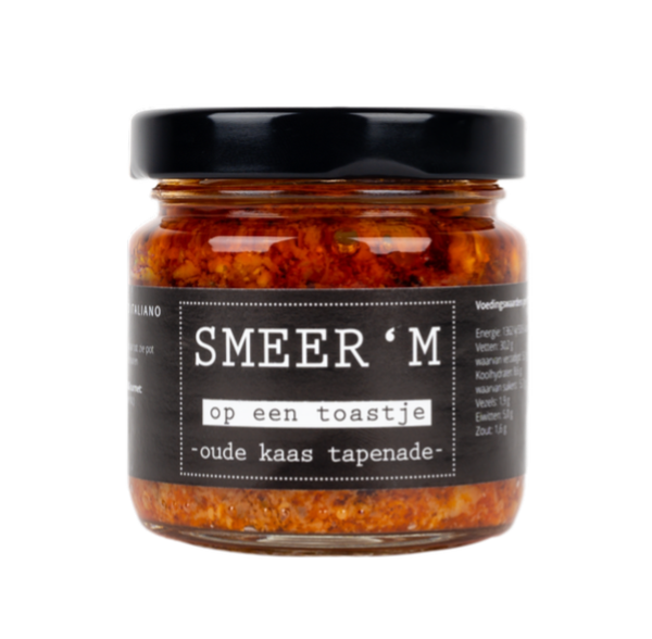 Een lekker potje oude kaas tapenade. Op het zwarte etiket staat de tekst 'Smeer 'm op een toastje!'. Een tapenade met ambachtelijke oude kaas. Een mix van de Italiaanse en Nederlandse keuken. Leuk op te verpakken in een borrelpakketje.