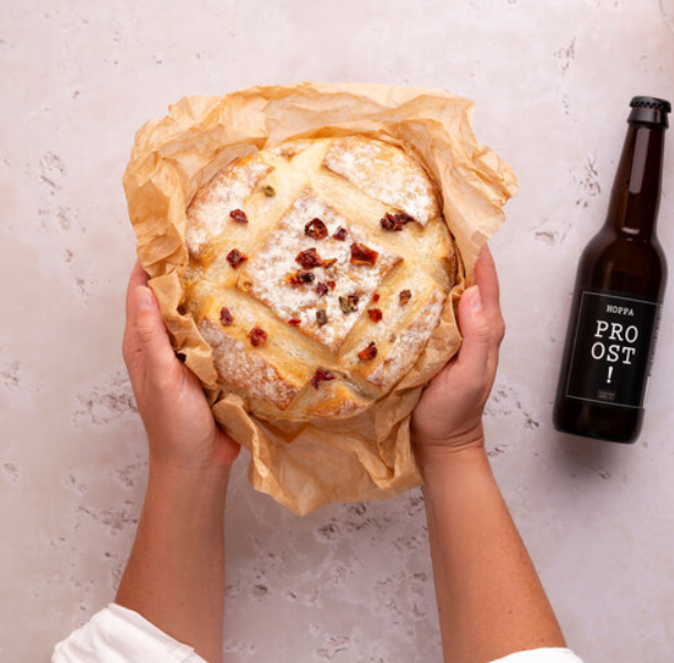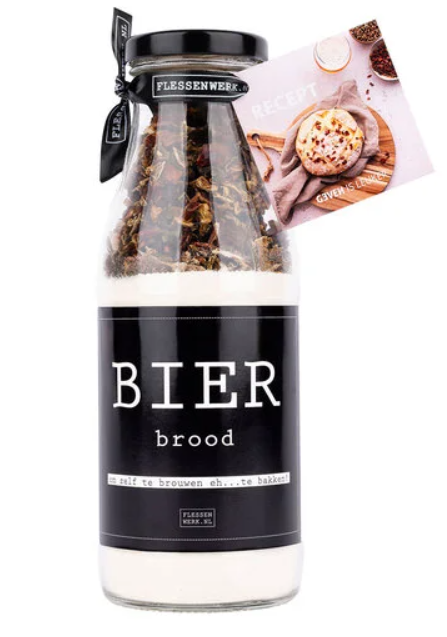 Een leuk flesje DIY bierbrood. Op het etiket staat de tekst 'Bierbrood om zelft te brouwen.... uh te bakken'. Een grappig een lekker kado om te geven in een leuk pakketje met wat biertjes erbij.