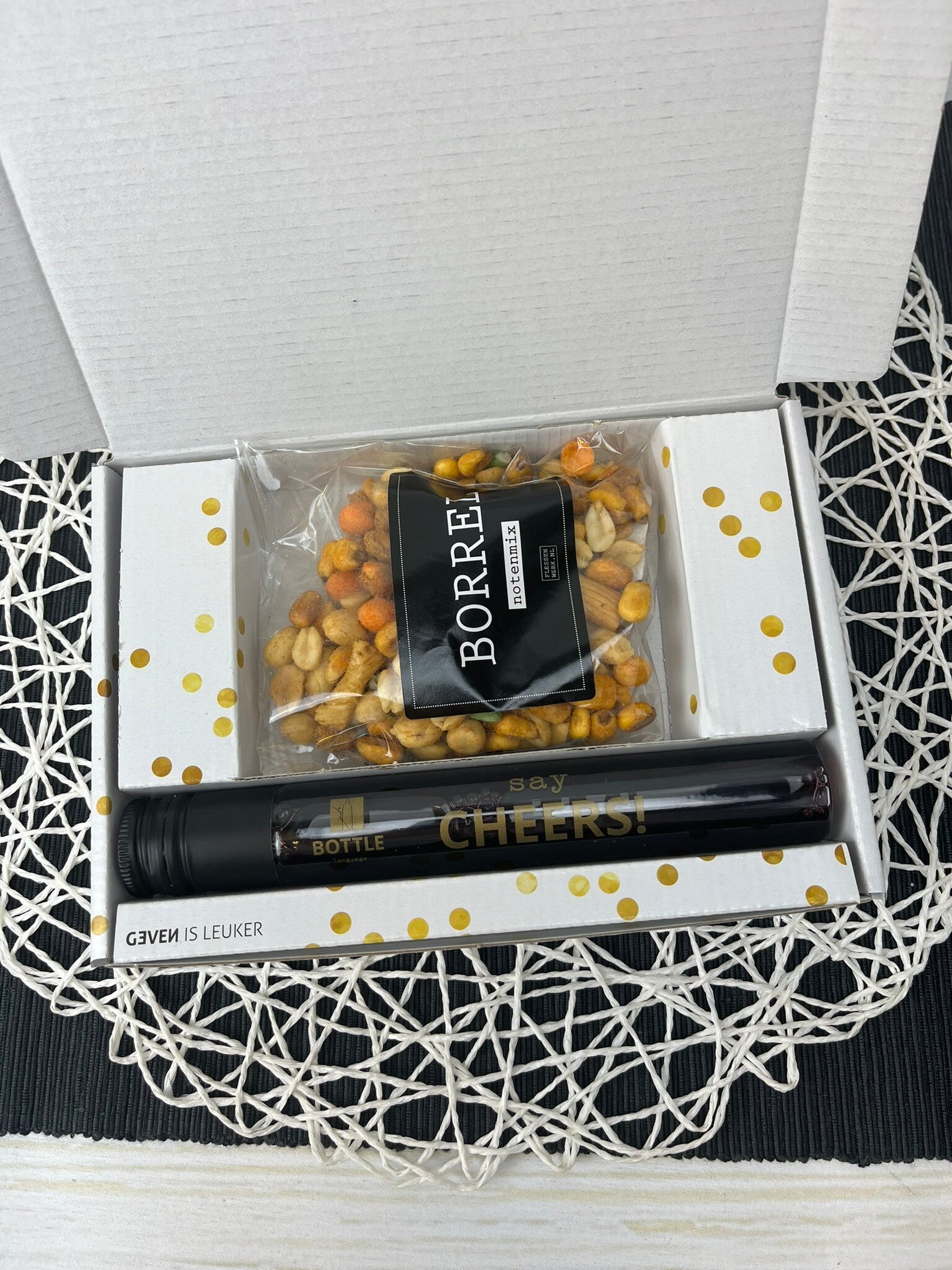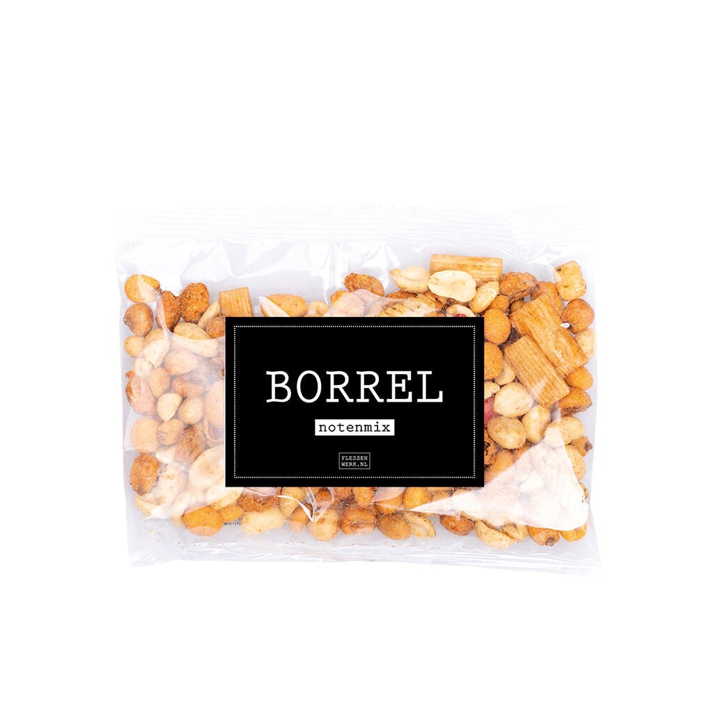 Let op: het zakje BORREL-notenmix is iets anders dan op de foto. De notenmix bestaat onder andere uit gebakken en gezouten pinda's, maisnootjes en borrelnoten. Past in het brievenbusdoosje.