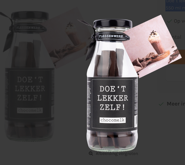 Een heerlijk flesje DIY chocomelk. Op het etiket staat heel toepasselijk de tekst 'Doe 't lekker zelf!'. Een grappig een leuk kado om te geven. Je hoeft alleen maar 550 ml melk toe te voegen.