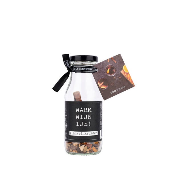 Een heerlijk flesje DIY glühwein. Op het etiket de tekst 'Warm wijntje'.