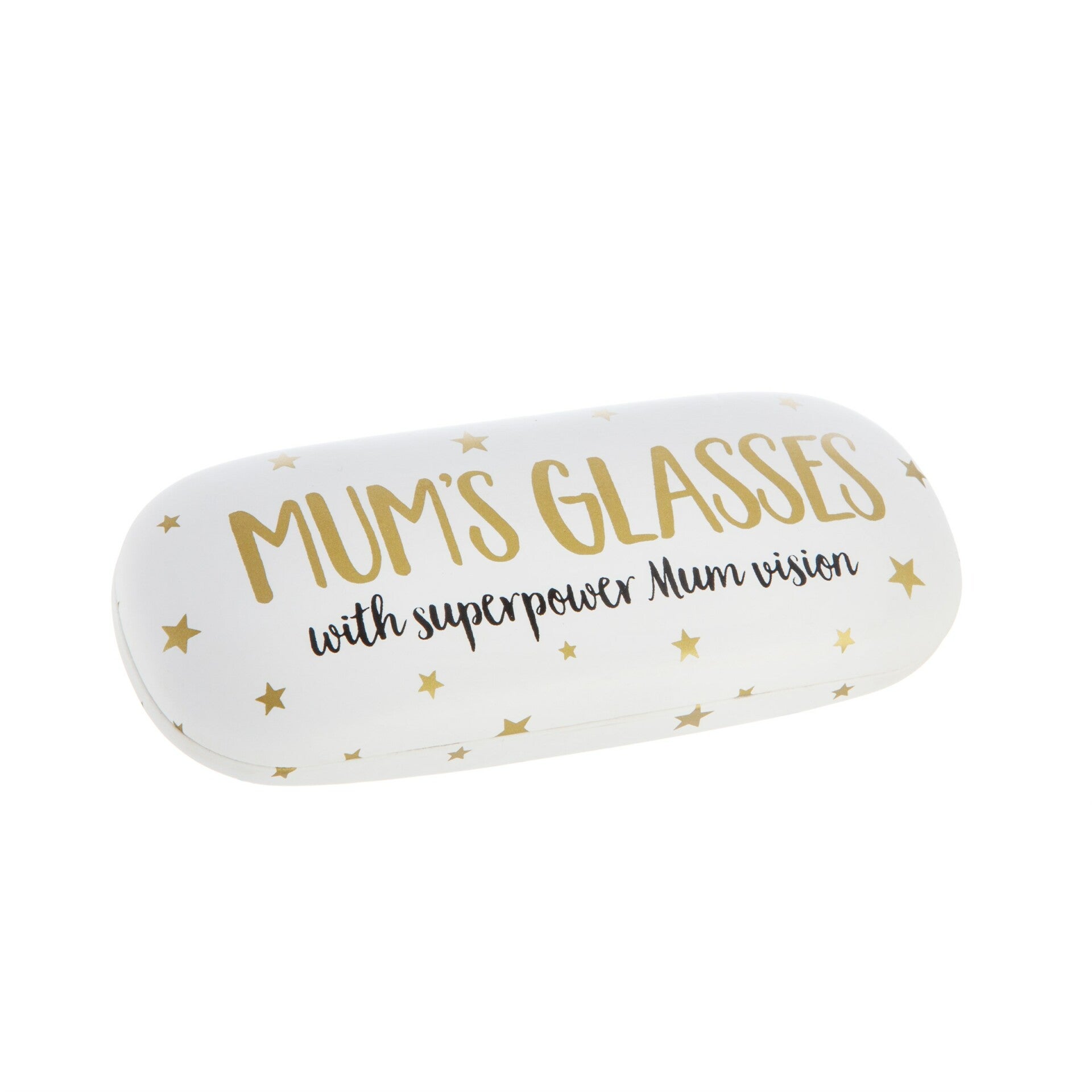 Supermoeders kunnen hun superpower bril beschermen met deze prachtige brillenkoker. In een strak wit met glanzende gouden sterren en contrasterende letters. Tekst: