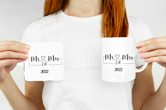 Leuk herinnering aan een huwelijk!Onderzetters:Tekst: Mr & Mrs est # jaartal#.Leuk om met bijpassende mok te geven.Je krijgt 4 stuks.