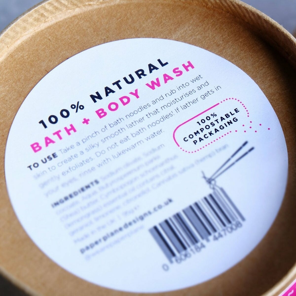 100% natuurlijke, veganistische badnoedels in plasticvrije biologisch afbreekbare verpakking. badnoedels!