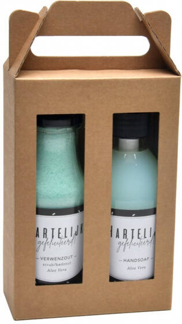 Giftset “Hartelijk gefeliciteerd” bestaande uit een fles badzout en een flesje handzeep in de heerlijk frisse geur van Aloë Vera.