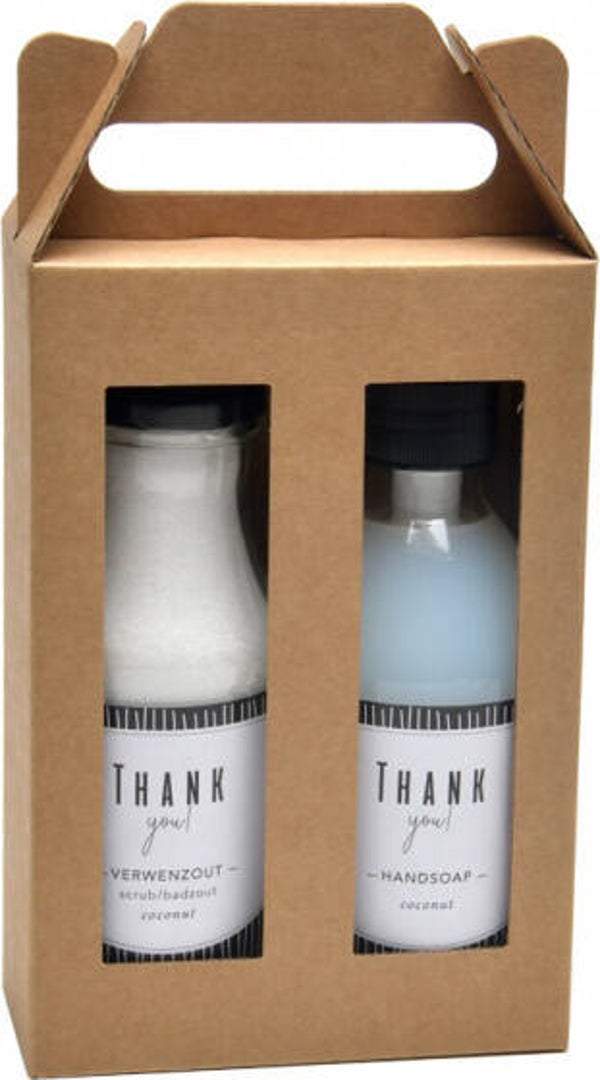Giftset “Thank you” bestaande uit een fles badzout en een flesje handzeep in de heerlijk geur van kokosnoot.