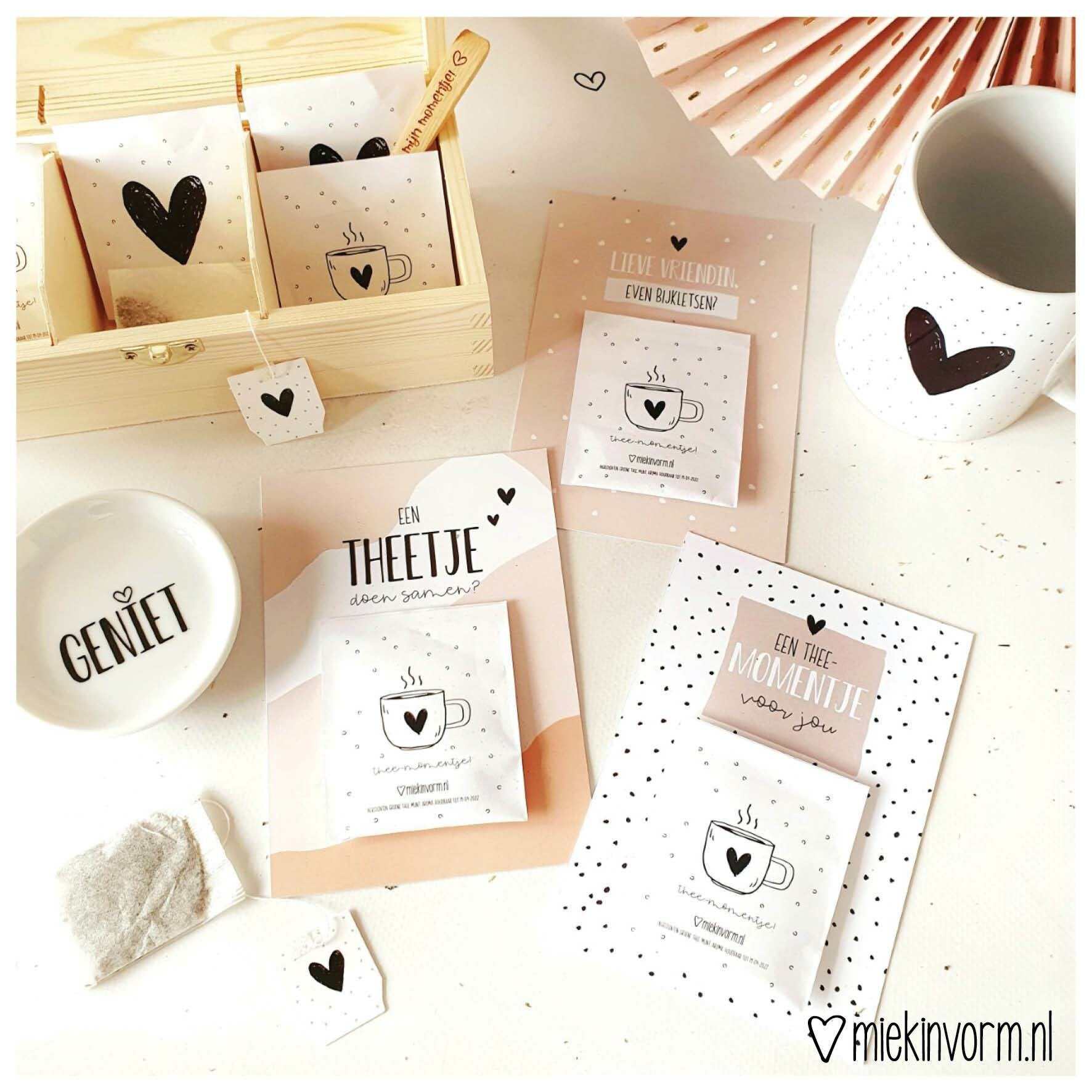 Voorop de kaart zit een theezakje met quote "lieve vriendin even bijkletsen?" met de smaak "groene thee met een beetje mint'.