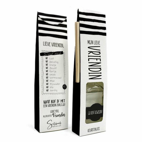 Op zoek naar een speciaal cadeau voor een vriendin? De Geurstokjes van SilliBeads zijn voor deze gelegenheid ontworpen. Daarnaast is het mooi gepresenteerd in een hippe zwarte witte verpakking. Het doosje bestaat uit een flesje met de frisse geur van bamboe en drie geurstokjes die er aan de linkerzijde in zijn gestoken.