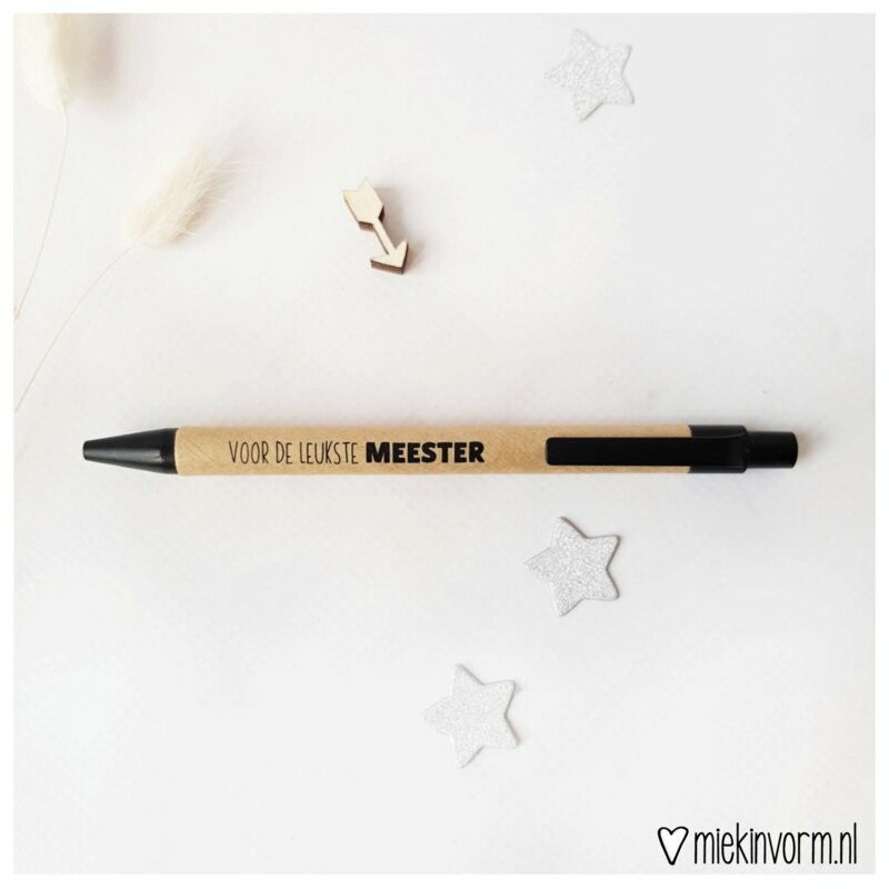 De pen is bedrukt met de tekst 'voor de leukste meester'.