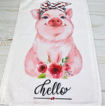 Grappig gastendoekje met varkentje en tekst Hello met hartjes.