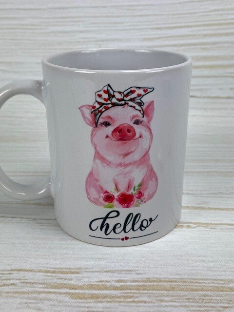 Grappige mok met varkentje en tekst Hello met hartjes.