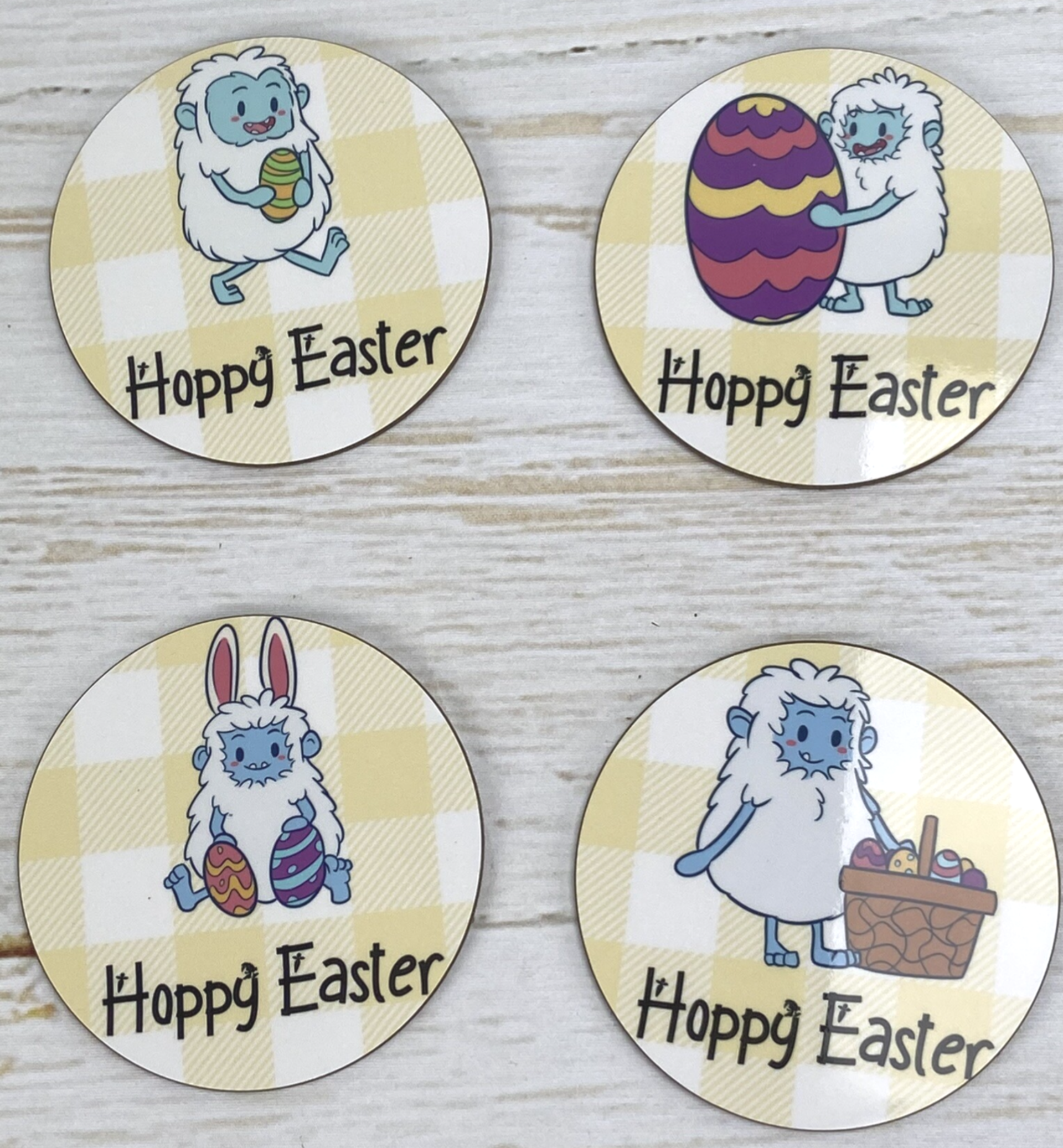 Niet zo van de zoete paashaasjes en kuikentjes? Dan hebben wij de Paas Yeti!Deze stoere onderzetters zullen geweldig staan op jullie paastafel...Er zitten 4 verschillende in deze set..Tekst: Hoppy Easter