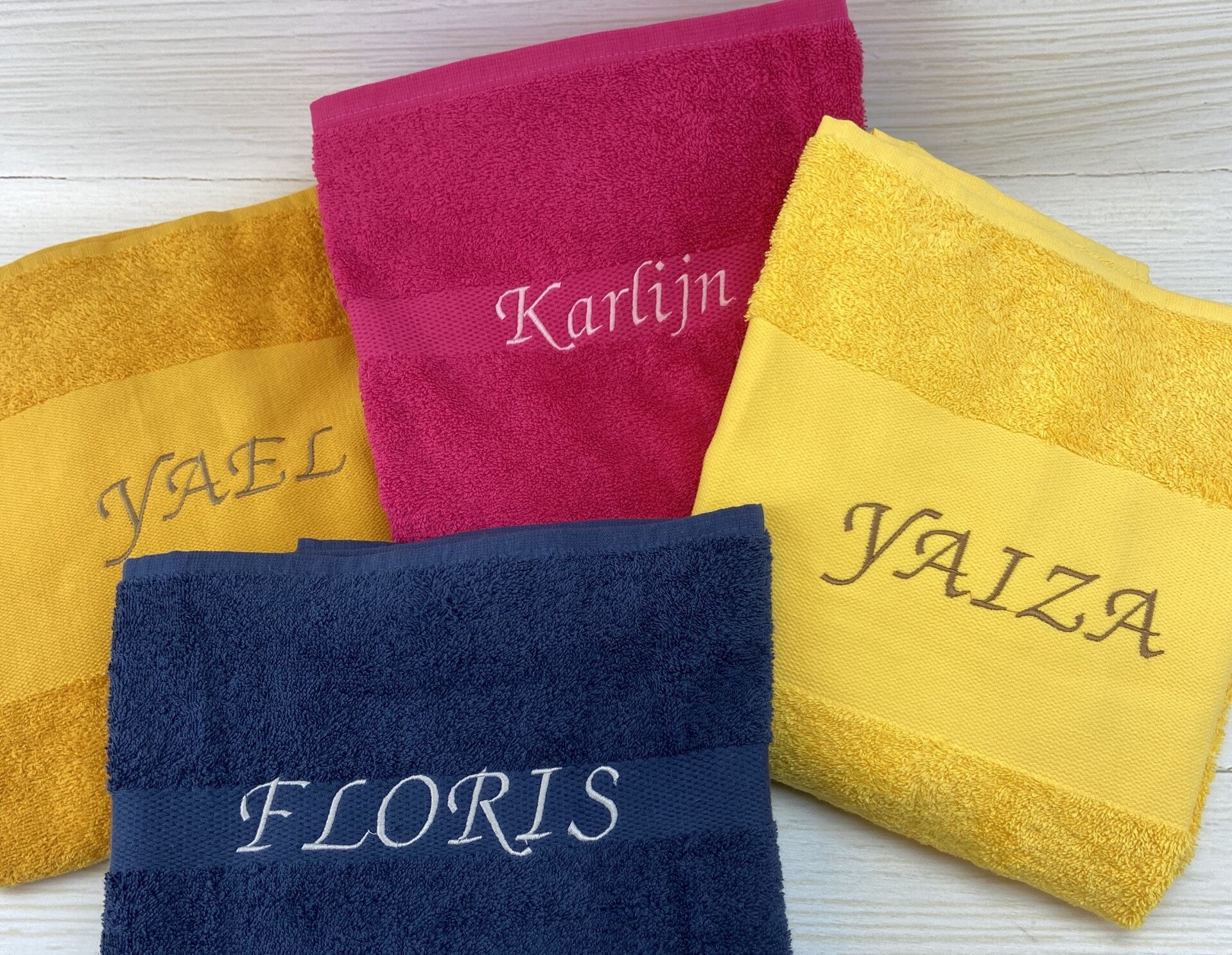 Handdoek, geborduurd met naam div kleuren/eigen tekst