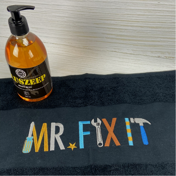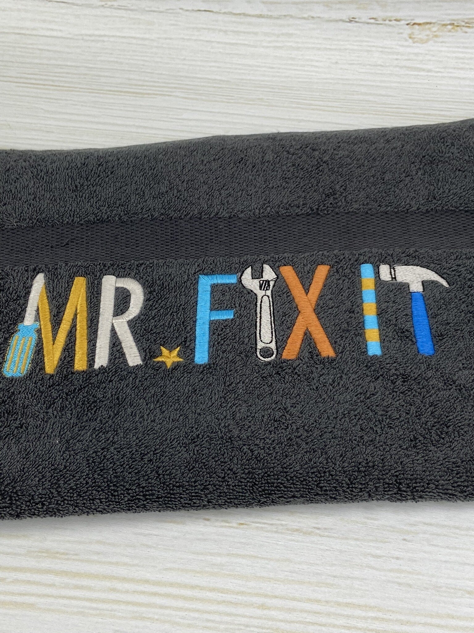 Prachtige geborduurde handdoek met afbeeldingen van gereedschap.