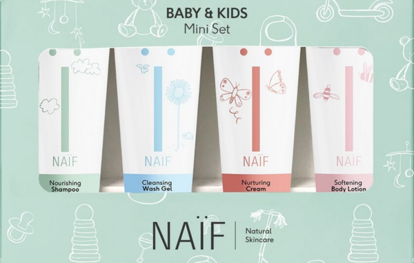 - NAIF Geschenkverpakking met de Nourishing Shampoo, de Cleansing Wash Gel, de Nurturing Cream en de Softening Body Lotion van Naïf in reisformaat.