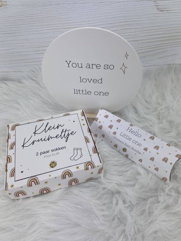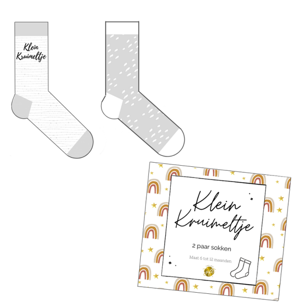 Dit prachtige doosje is voorzien van 2 paar sokken in de maat 62-68. Een perfect kraamcadeau voor een kleintje die op komst is of is geboren.