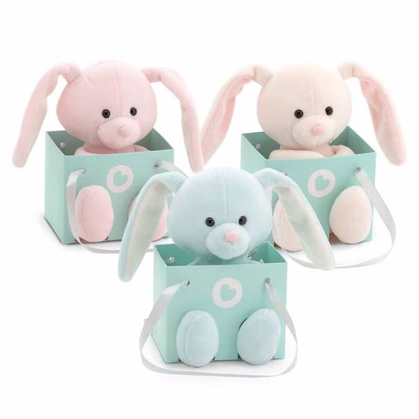 De schattigste veelkleurige konijntjes staan klaar voor jou! Het is een perfect kraamkado'tje: Elk konijntje is verpakt in een mooi mintkleurig doosje. Je kunt het zo versturen of geven.