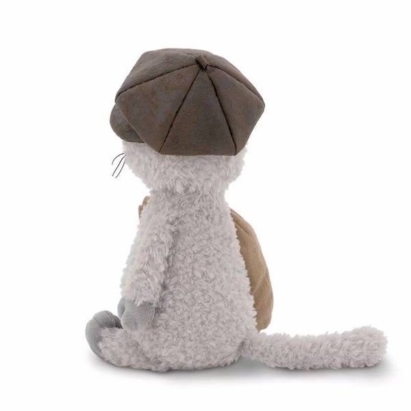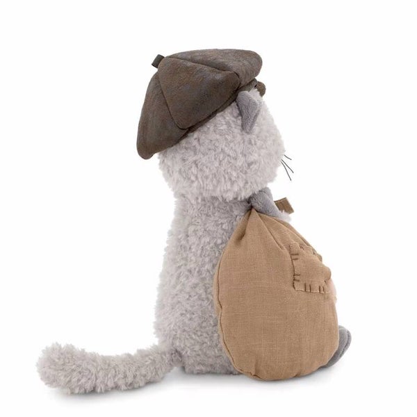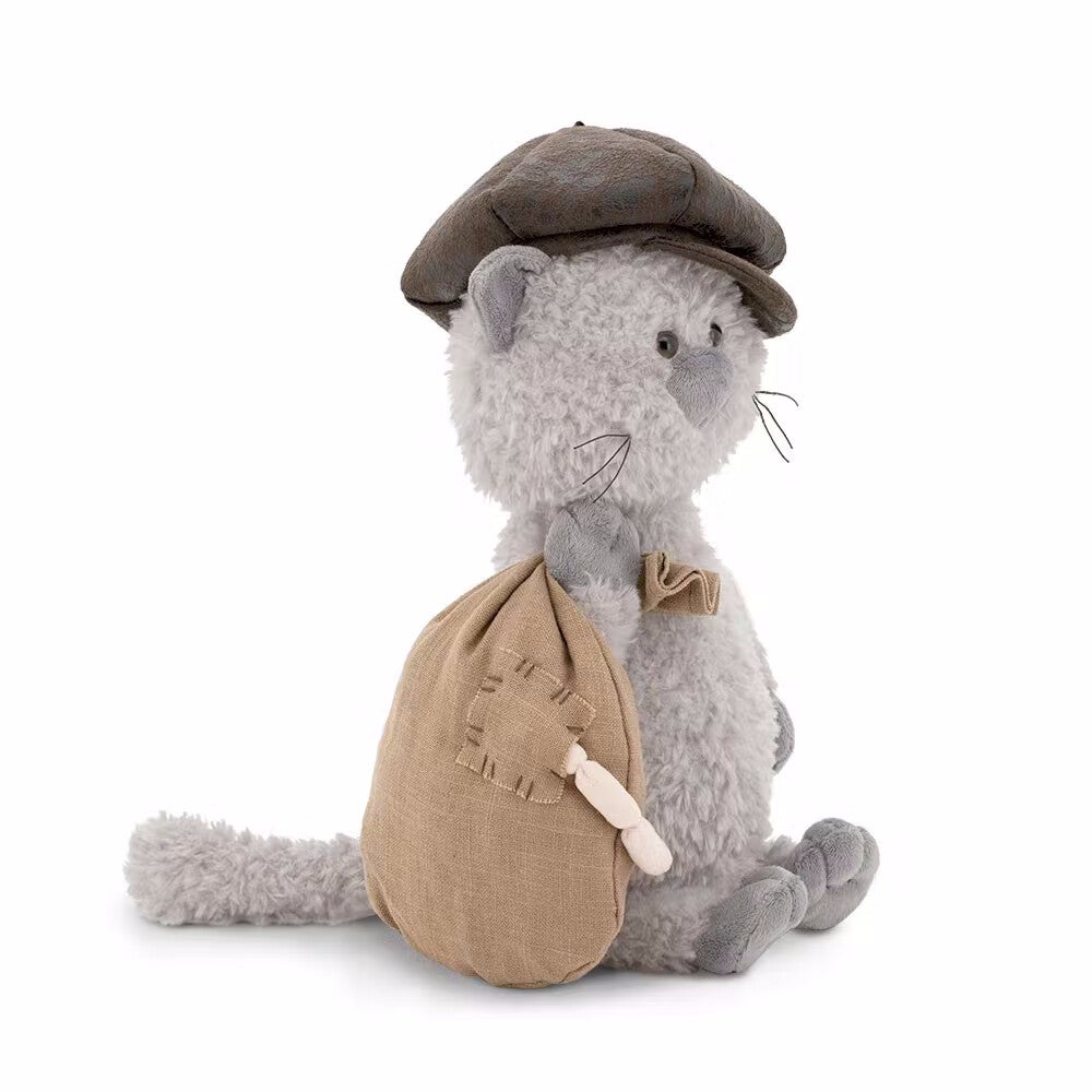 Innemende knuffel die een tasje bij zich heeft met zijn eigen eten!...Worstjes! En een heuse baret op zijn hoofd...
