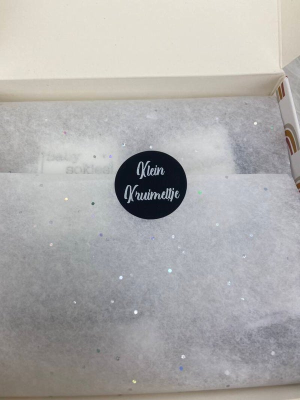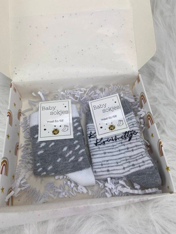 Dit prachtige doosje is voorzien van 2 paar sokken in de maat 62-68. Een perfect kraamcadeau voor een kleintje die op komst is of is geboren.Materiaal:KatoenGemaakt in Nederland