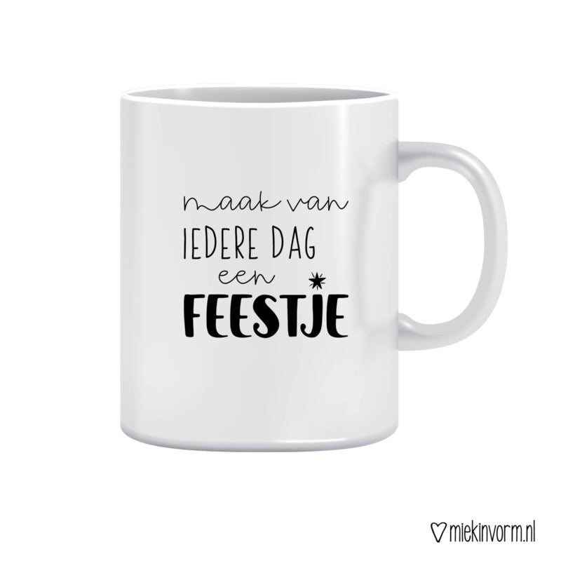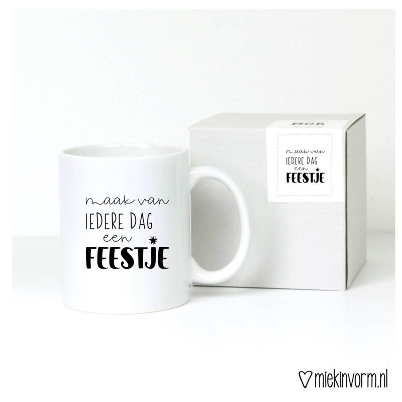 Een supertoffe thee- of koffiemok met quote:"Maak van iedere dag een feestje " en een sterretje op de voorzijde. Of voor een lekkere warme chocolademelk. Geef deze mok kado aan een vriendin, collega, vriend, buurvrouw of wie jij wilt. Niet geheel onbelangrijk, de mok is vaatwasser- en magnetronbestendig. Formaat: hoogte 95 mm doorsnede 81 mm inhoud 300 ml De mok wordt geleverd in een giftdoosje van wit kraft karton met een sticker.